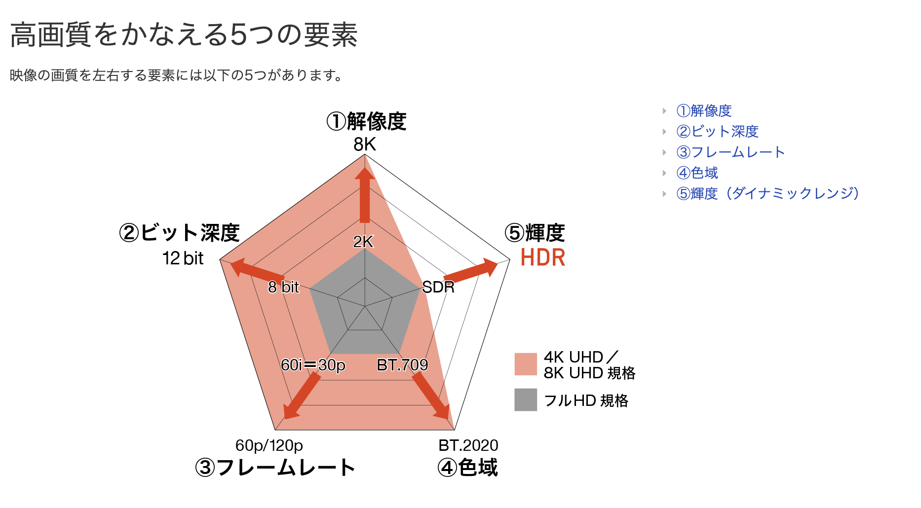EIZOのサイトでは、「高画質をかなえる5つの要素」が説明されています。ウェブでは“色域”は以前からCSSで扱えましたが、2025年に“輝度(HDR)”も扱えるようになったかたちです。