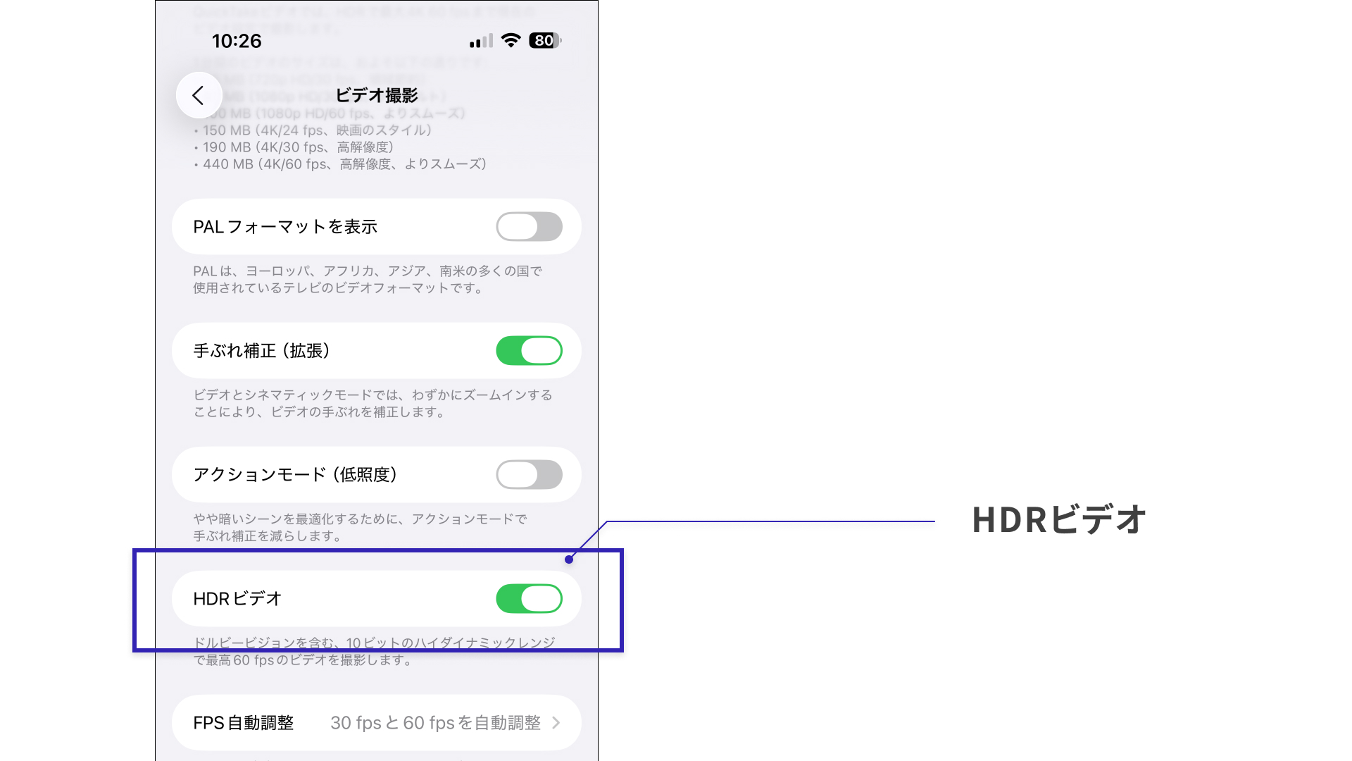 iOSでの動画撮影では、HDRのON/OFFが選べます。やはり、ユーザーは技術としてのHDRを知らずとも、HDRでコンテンツを作っている可能性が高いといえるでしょう。