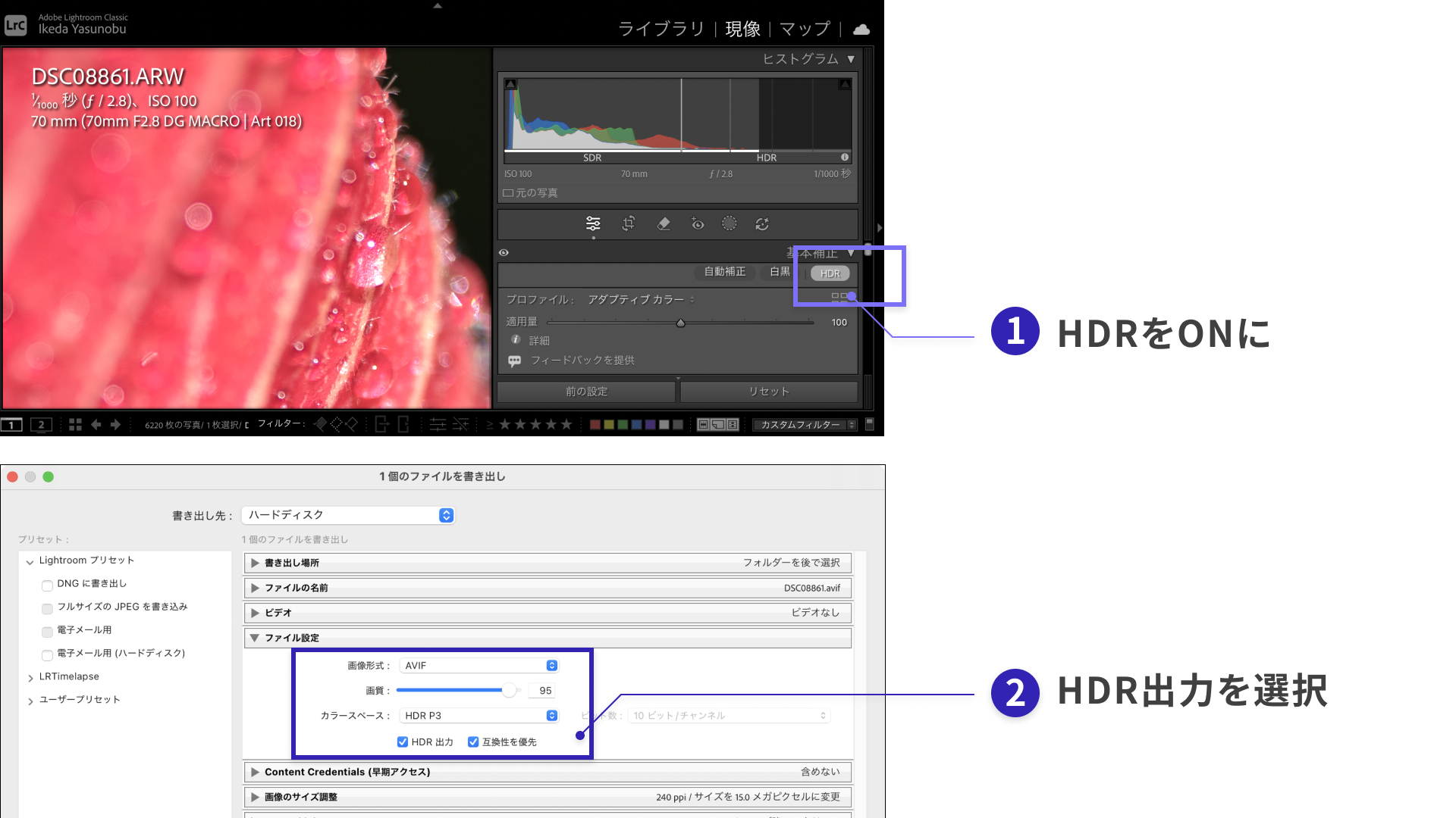 Adobe Lightroom Classicでは、現像モジュールの[基本補正]にある[HDR]を有効にすると、ヒストグラムや各パラメーターがHDR編集向けに切り替わります。書き出し時は[ファイル設定]でAVIFやJPEGなどの形式を選び、[HDR出力]をオンにして保存します。