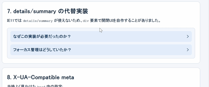 標準のUI要素としてdialogタグやdetails/summaryタグがありますが、IE11は非対応です。当時はモーダルもアコーディオンもdivタグとJavaScriptで自作されることが多かったです。