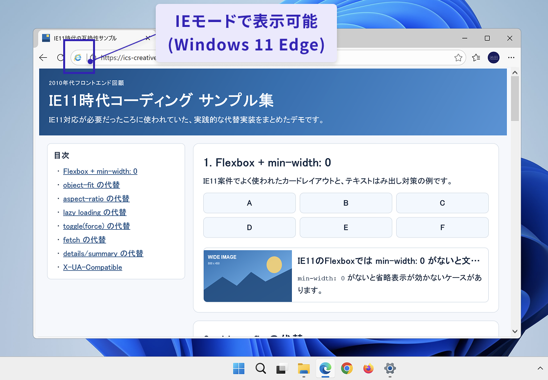 本記事のサンプルを掲載していますので、ぜひIEモードを使ってご覧ください。当時の苦労を思い出すことができると思います。