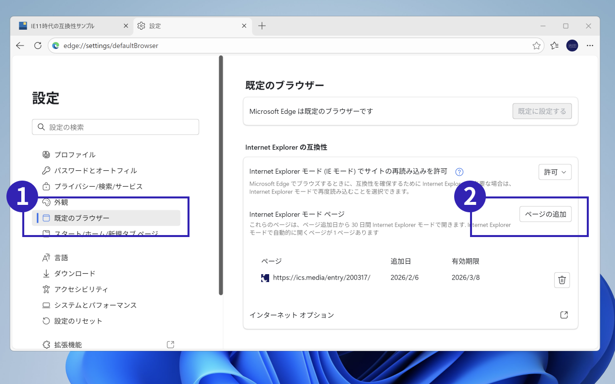 そんな懐かしいIE11ですが、Windows 11でもMicrosoft Edgeブラウザを利用すれば、限定的にIEモードを利用できます。IEモードは少なくとも2029年までサポートされます。