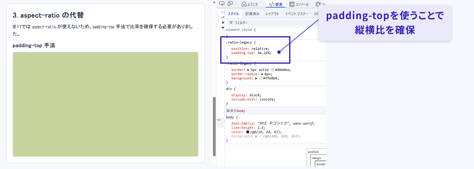 縦横比を確保するCSSのaspect-ratioがありませんでした。そのため当時はpadding-topを使って比率用の領域を確保する手法が用いられていました。