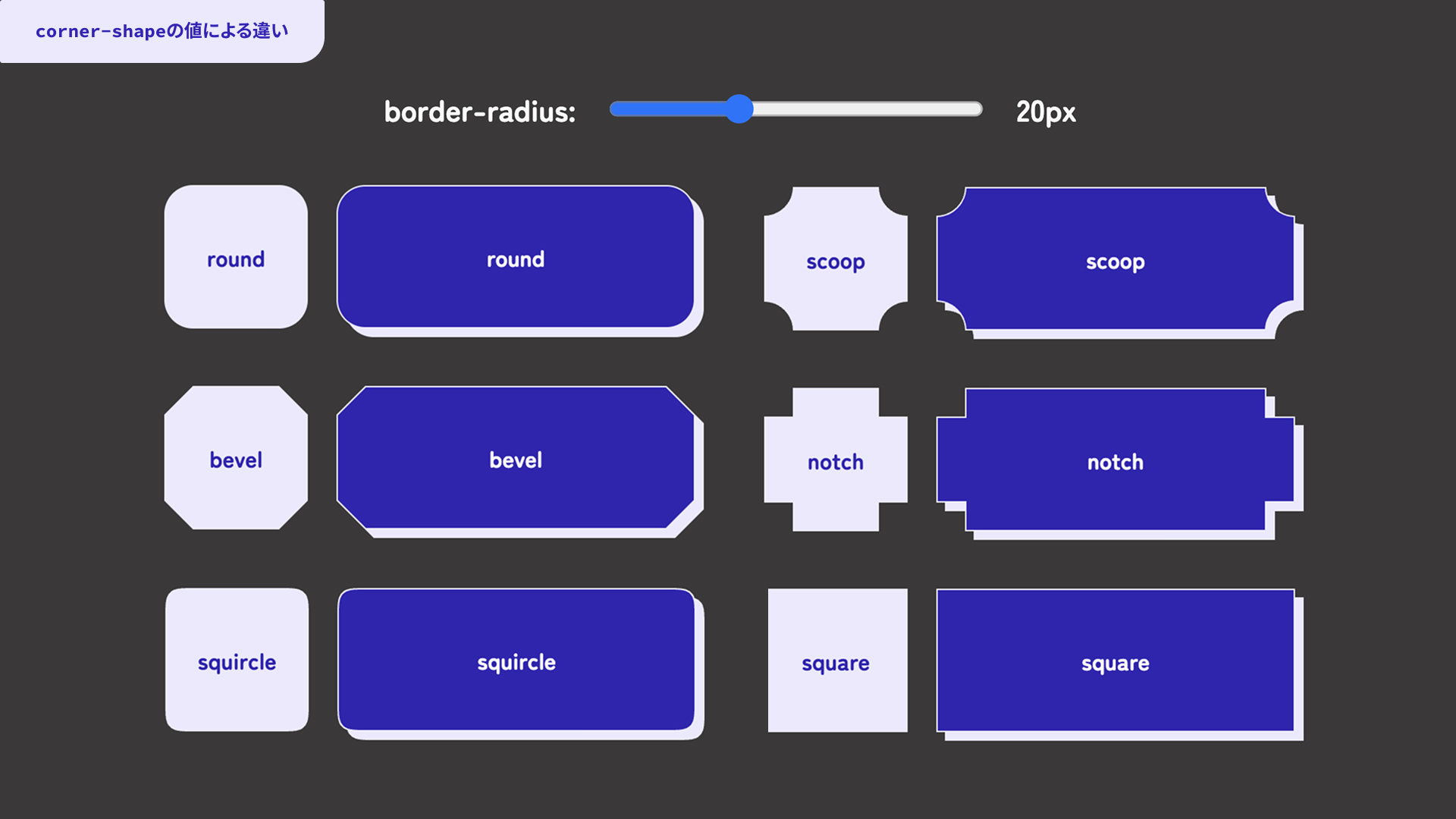 以下のデモでは、corner-shapeプロパティの値による形状の違いを確認できます。あわせてborder-radiusプロパティの値もスライダーで変更できます。ぜひ動かしてみてください。