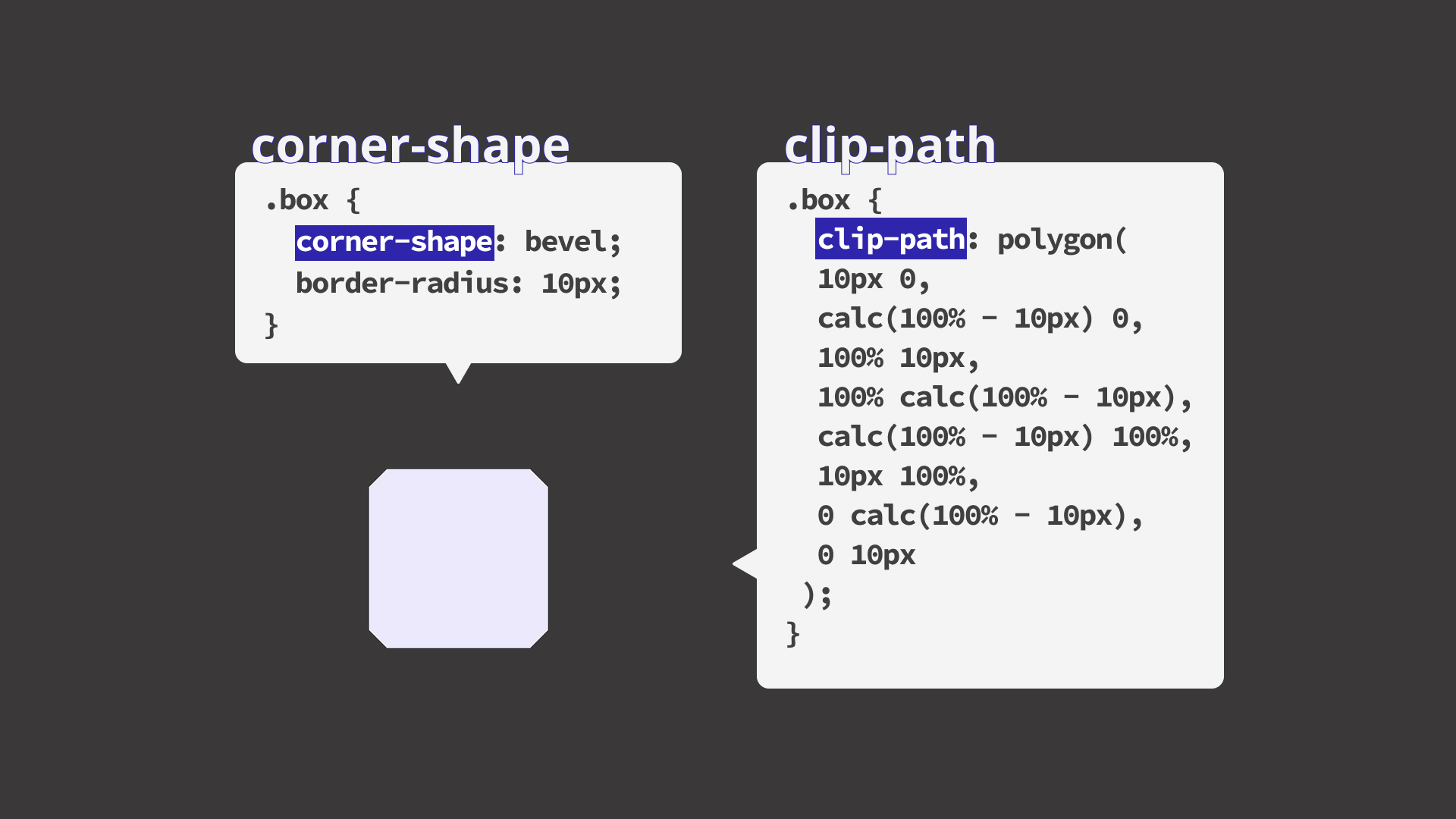 corner-shapeプロパティを使うと、SVGやclip-pathを使う場合と比べて、何をしているコードなのかが直感的に分かりやすくなります。また、形状や色・大きさなどもCSSの値として簡単に変更できます。アニメーションの表現にも役立ちそうですね。