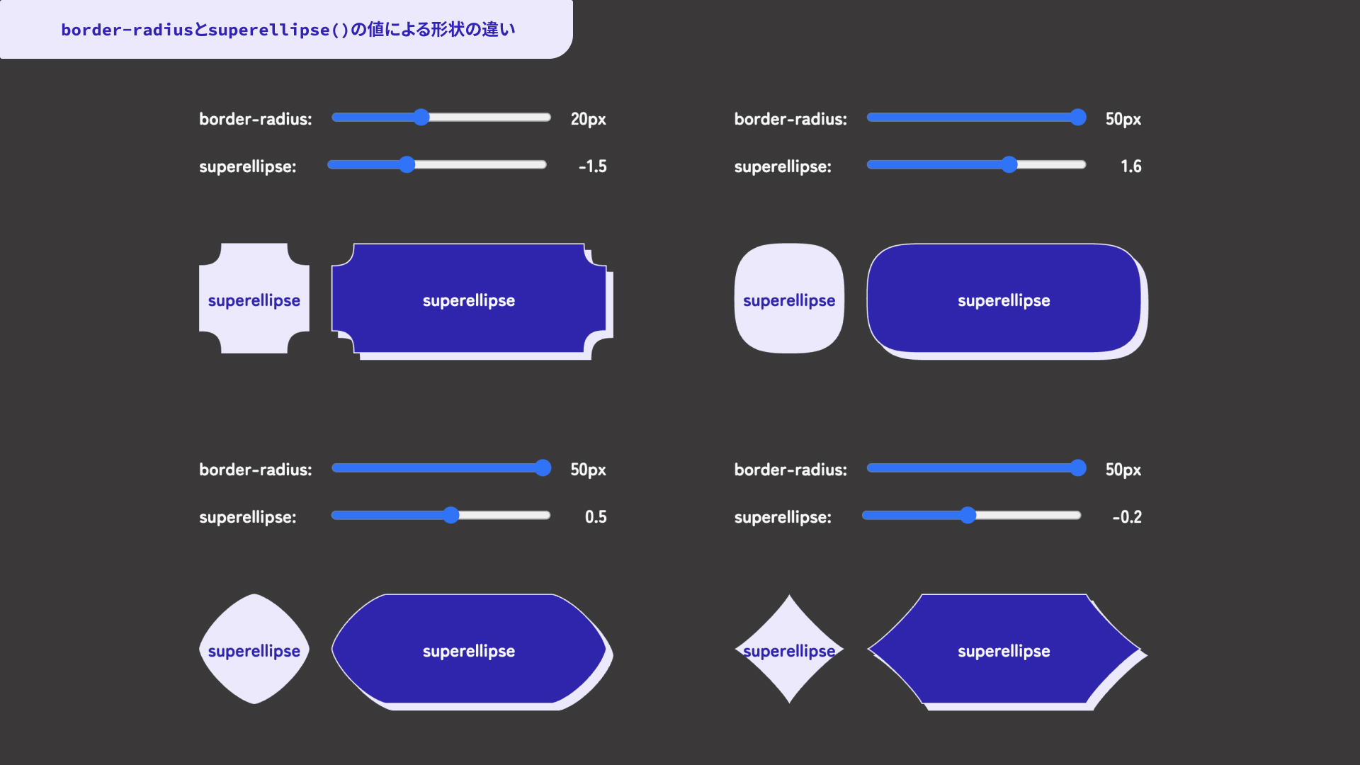 以下のデモでは、border-radiusプロパティの値とあわせて、superellipse()の引数もスライダーで変更できます。