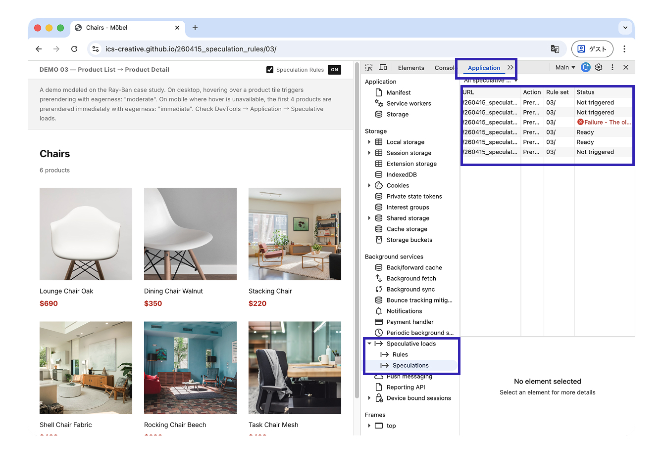 実装したら、前述のDevToolsのApplication → Speculative loadsで動作を確認しましょう。