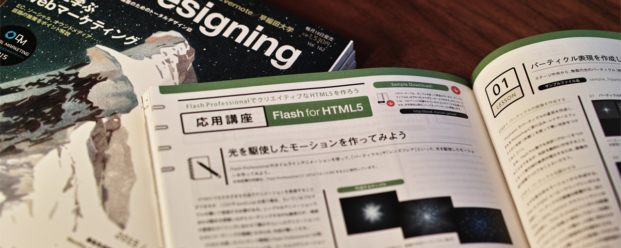 マイナビの月刊誌Web Designingにてクリエイティブなコンテンツの制作手法をテーマとした「応用講座 Flash for HTML5」を沖良矢さん(世路庵)と私の二人で連載していました。本記事では連載で開設したHTML5 Canvas (CreateJS)のサンプルをまとめて紹介します。