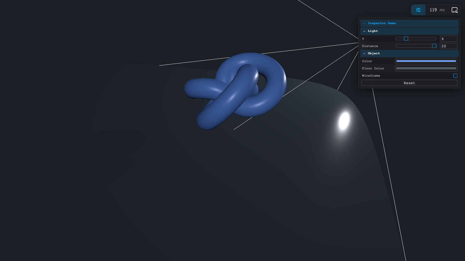 このサンプルでは、Inspector が変更した値を settings に持たせて、apply() で three.js のオブジェクトへ反映しています。